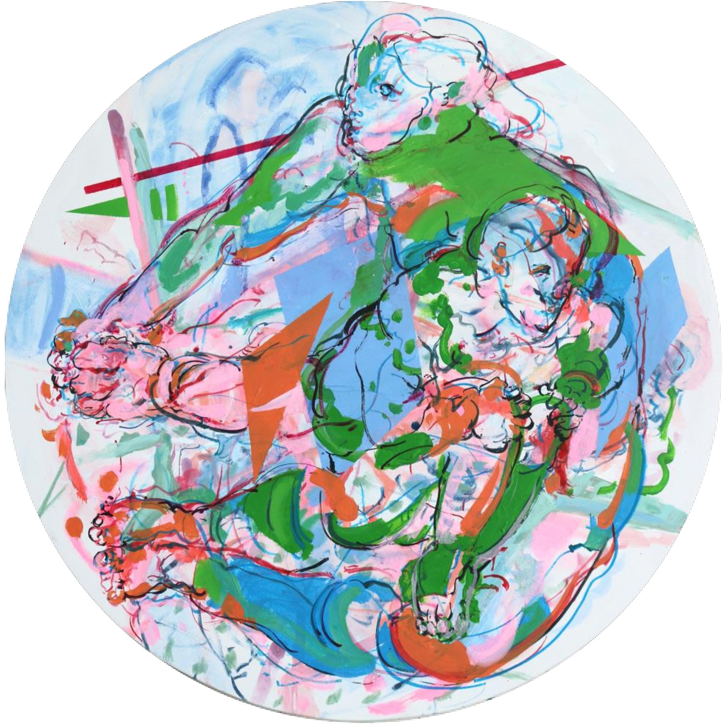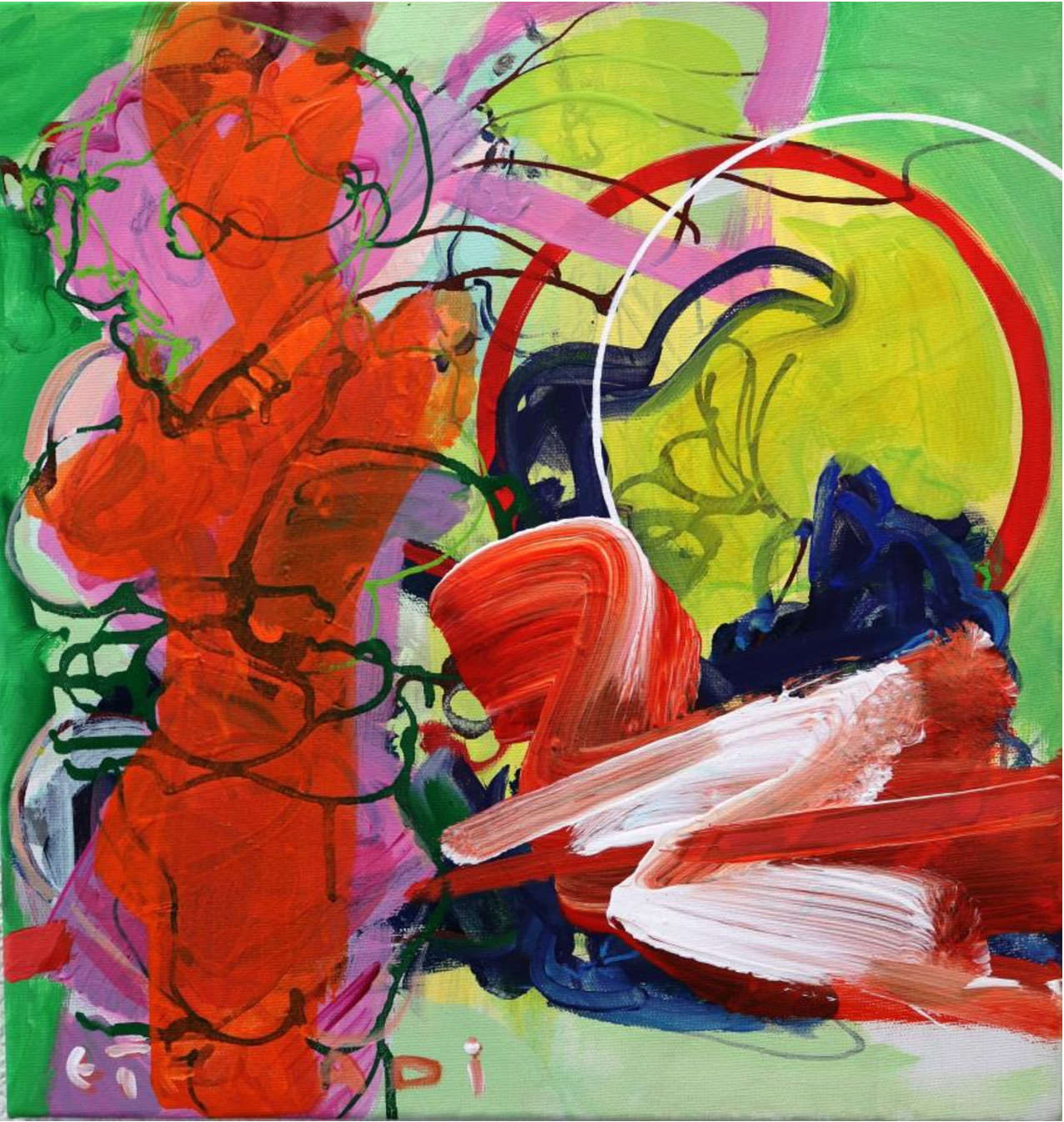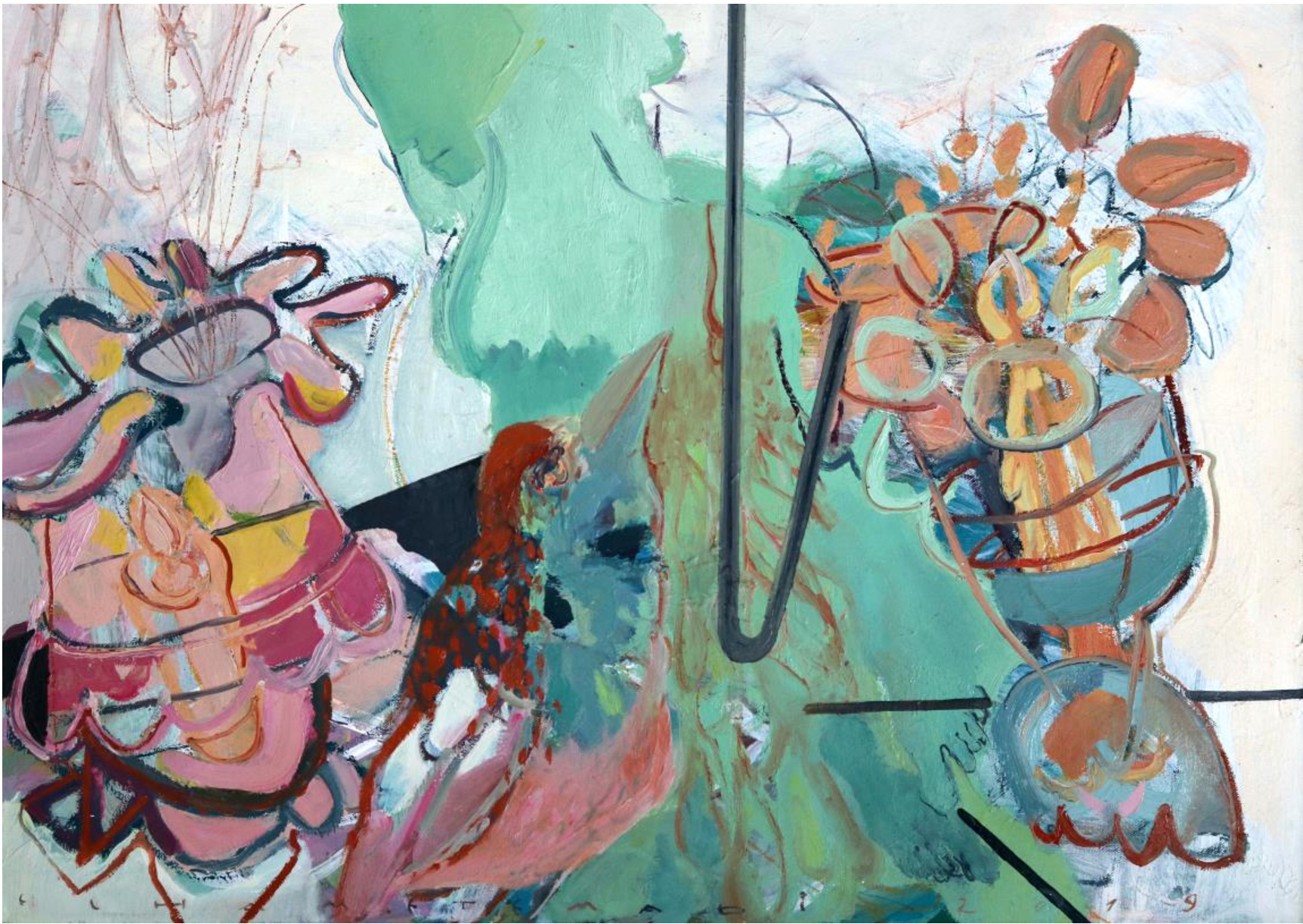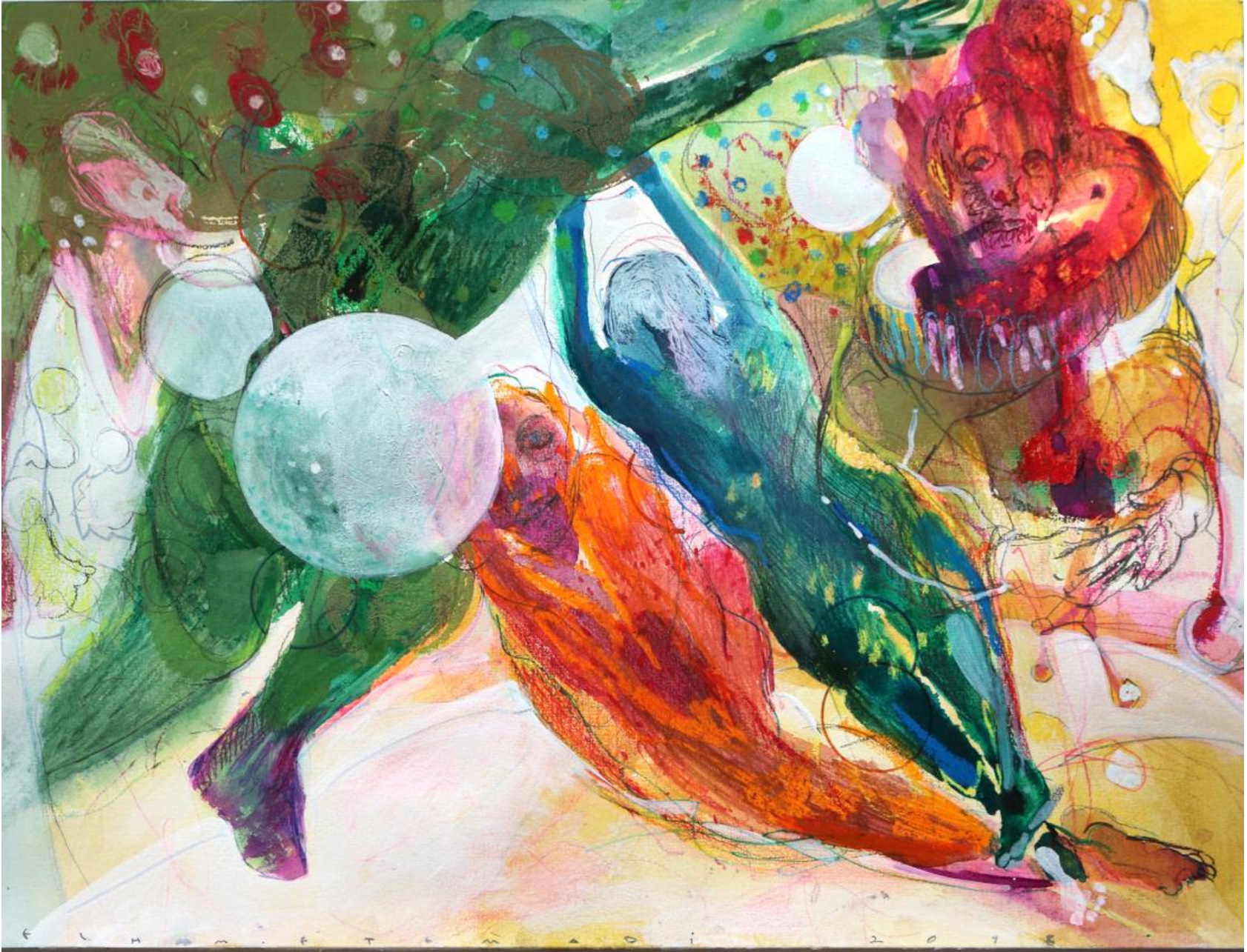 Dans son univers, chaque toile est une invitation à la découverte, un appel à l’émer- veillement. À travers des paysages peuplés de lapins et d’oiseaux, ou des explo- sions de couleurs vives et éclatantes, elle nous convie à une expérience sensorielle où se mêlent angoisse et plaisir, conflit et quiétude, mystère et énergie. Chaque tableau est une scène mouvante où se déploient l’action et la stabilité, où la fragile harmonie est constamment menacée par les forces contraires, rappelée à chaque instant par le bruit des roues de vélo et le tourbillon des manèges, défiant la gravité.